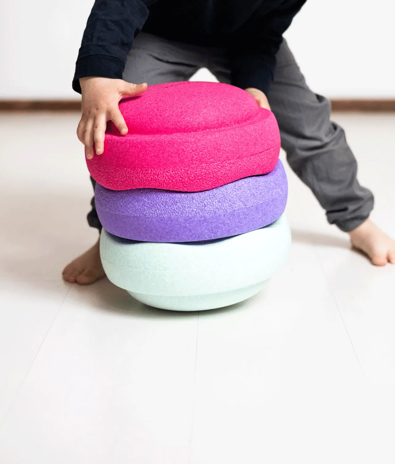 - Te gebruiken met water, of in bad. Zelfs als de stapelstenen nat zijn blijven ze stroef op de ondergrond. Dus zet je parcours maar uit!